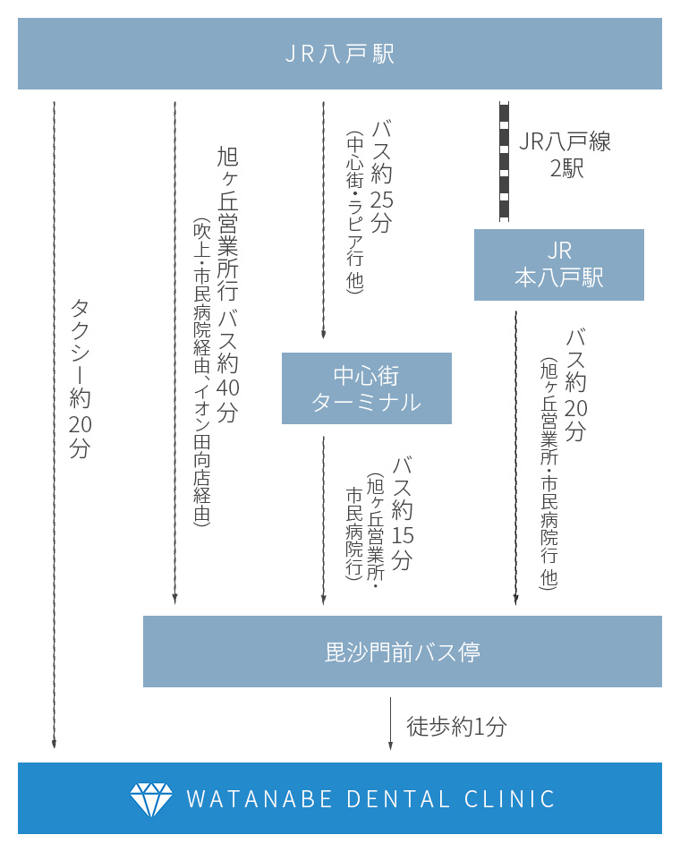 | バス | 「八戸市民病院」行きのバスに乗り、「毘沙門前」バス停で下車後、徒歩1分 |