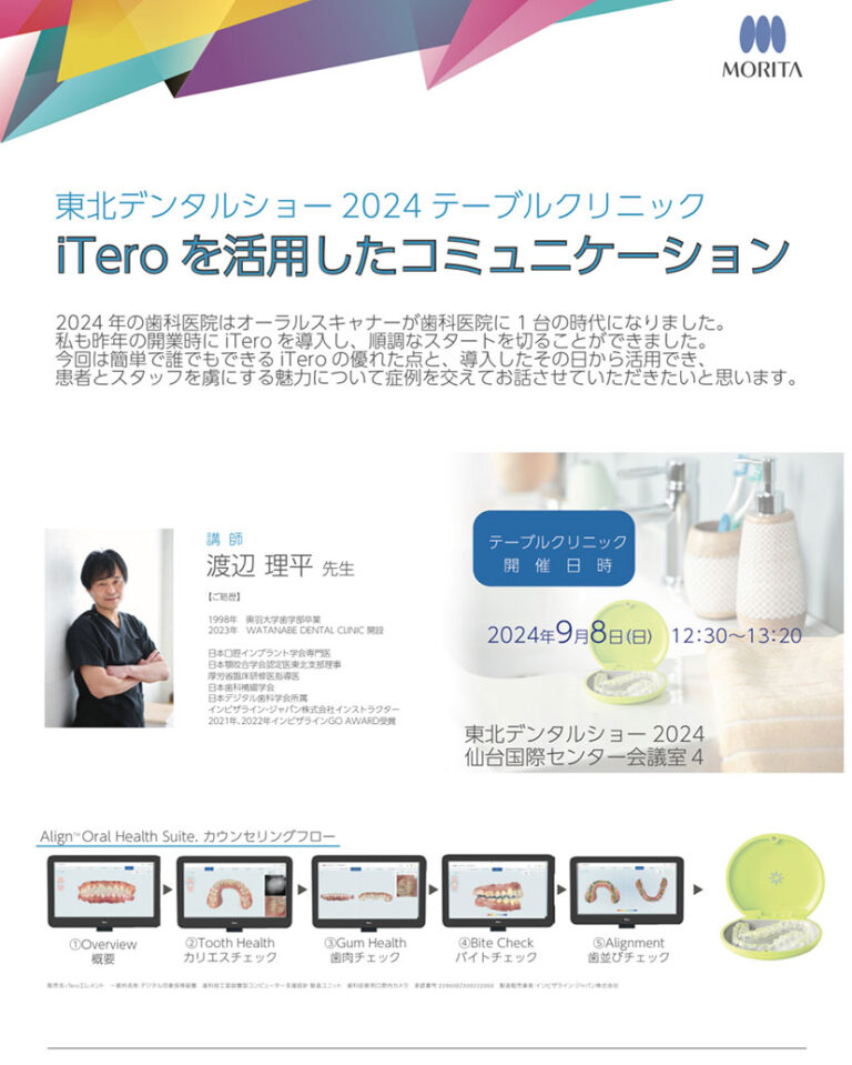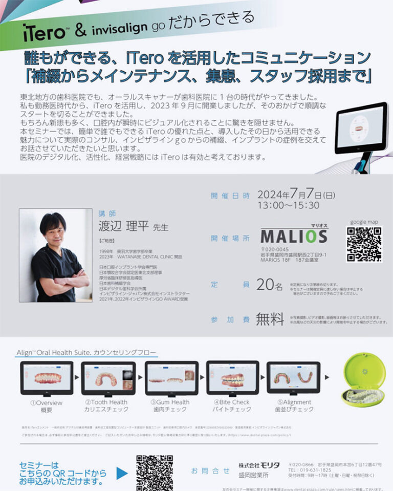 【歯科医院向けセミナーのご案内】誰もができる、iTeroを活用したコミュニケーション 株式会社モリタ主催の歯科医院向けセミナーのご案内です。 盛岡、沖縄、福岡、東京で開催予定です。 ▼お 2024.04.12