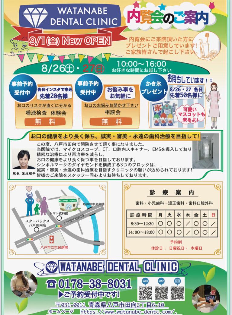 今年9月に八戸市田向、新井田地区に開院する 歯科医院の代表、歯科医師の渡辺理平と申します。 1998